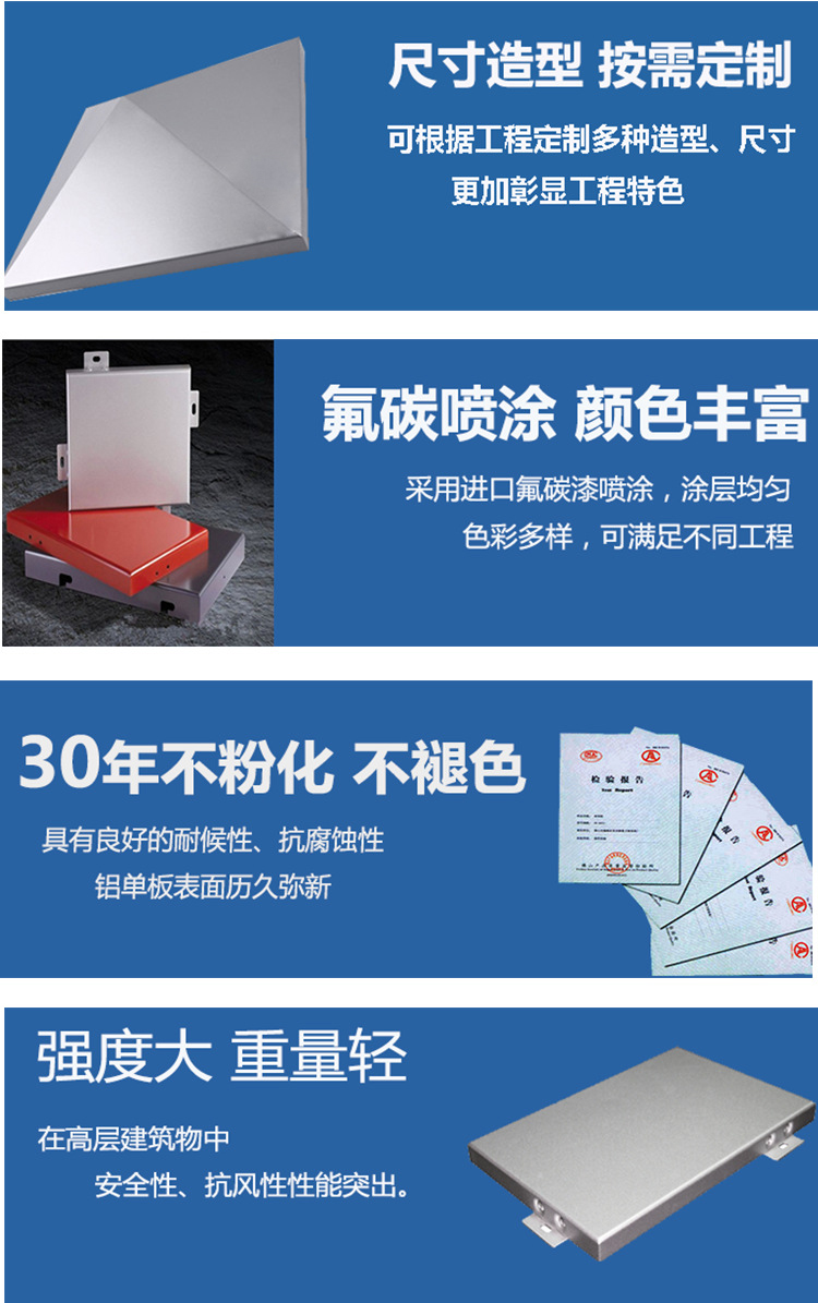 鋁單板采用優質鋁板加工而成,表層采用氟碳噴涂,不受紫外線、溫度、氣溫和大氣侵蝕,更具有良好的抗彎曲度及優良的抗風壓性能,并且能夠發揮其特點, 二次開發使用。鋁單板可加工成各種弧